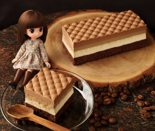 - ベース層: 豆から挽いたコーヒーをしみ込ませたチョコスポンジ生地。