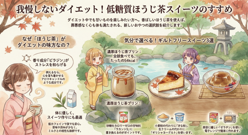 ダイエット成功の鍵🔑は「我慢」ではなく「賢い選択」です。今回ご紹介したほうじ茶スイーツなら、美味しさ・満足感・ヘルシーさをコンプリートできます♪